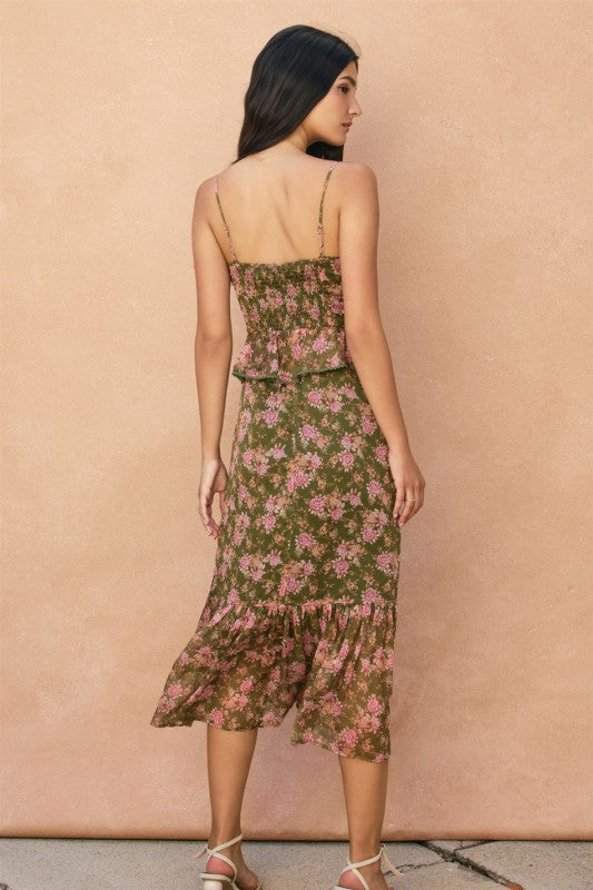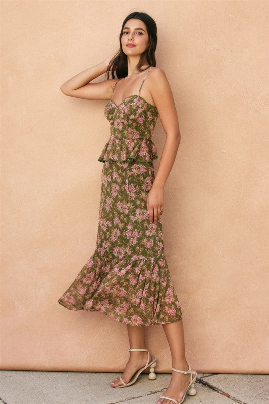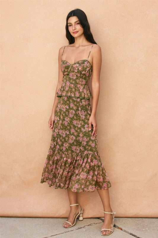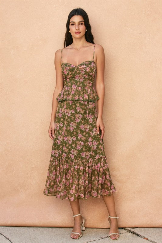 Floral Bustier Peplum Gold Foil Maxi Dress