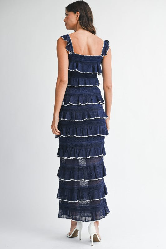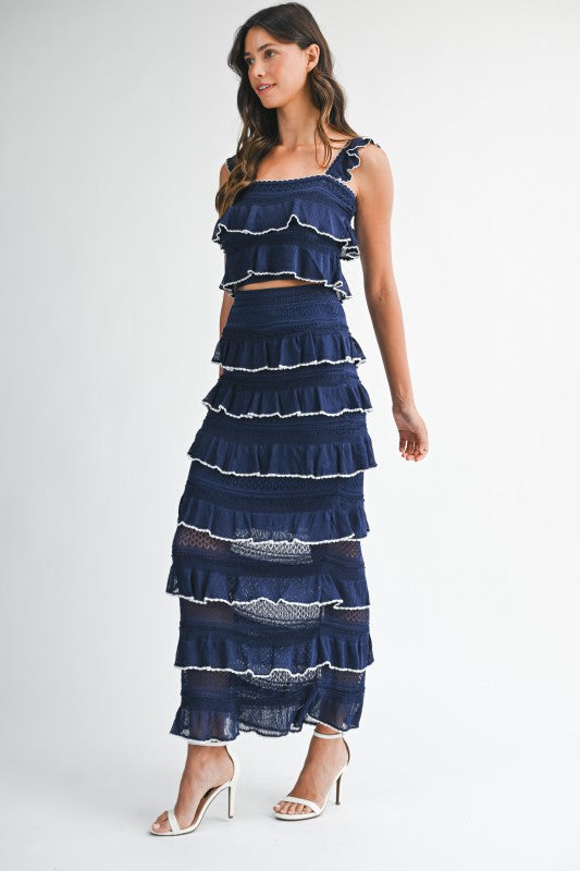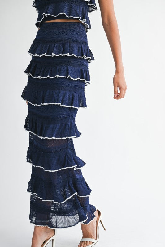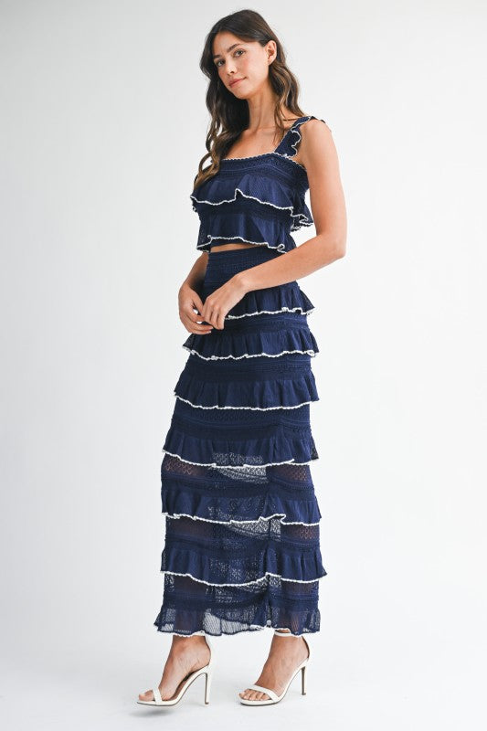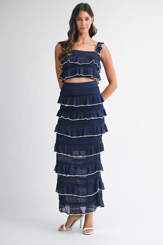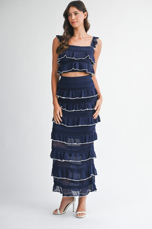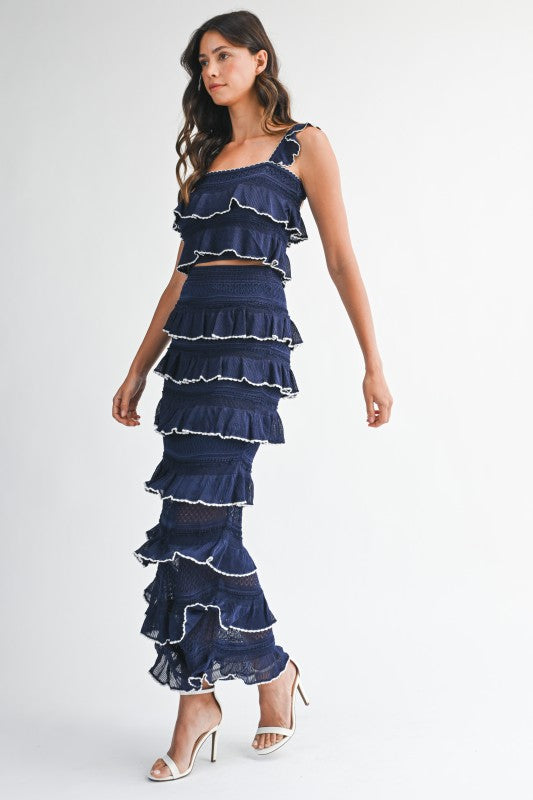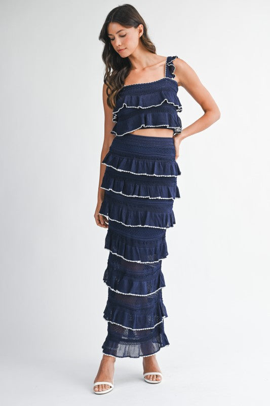Ruffle knit crop top and midi skirt set.