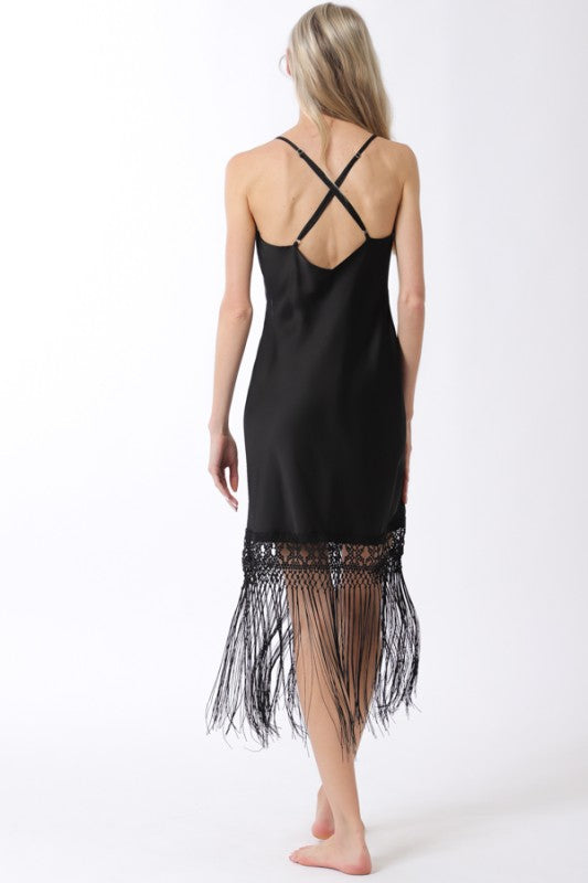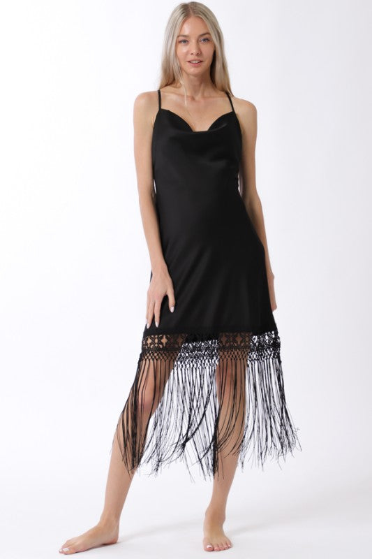 Cowl Neck Fringe Hem Satin Slip Midi Dress