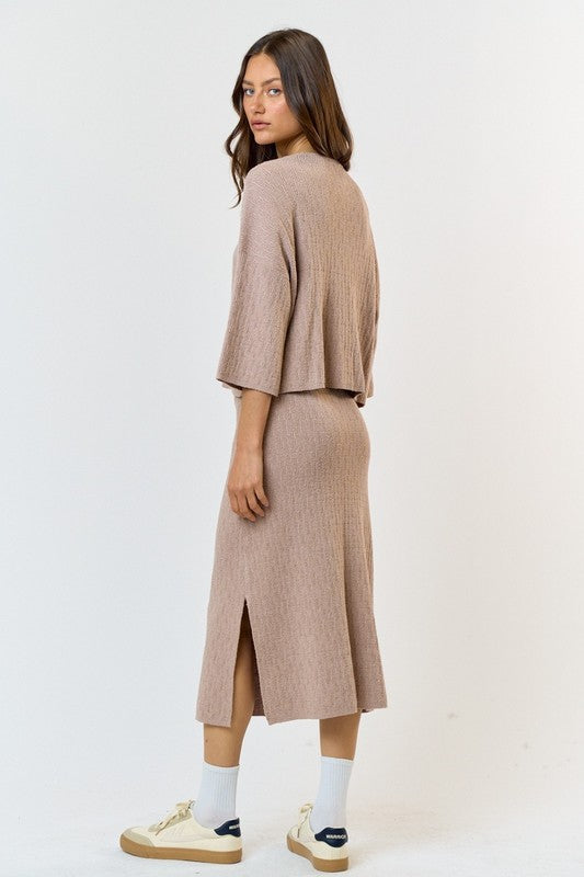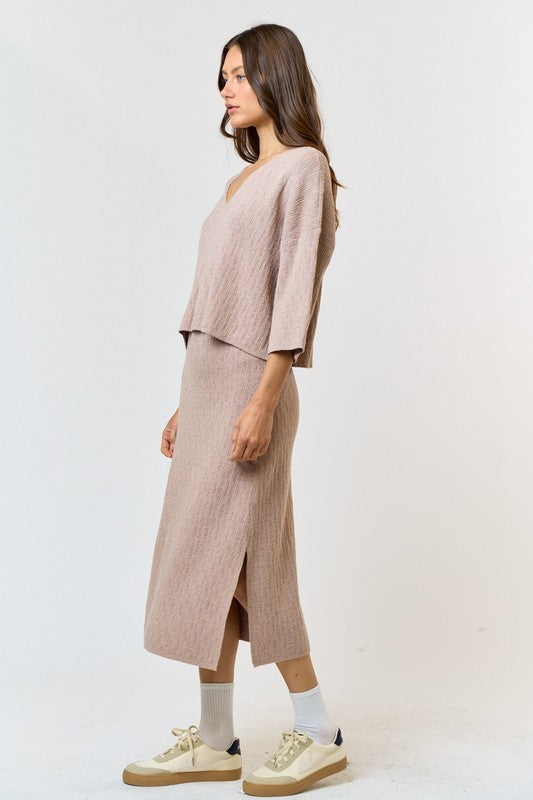 Knit V-Neck Long Sleeve Top & Midi Skirt Set