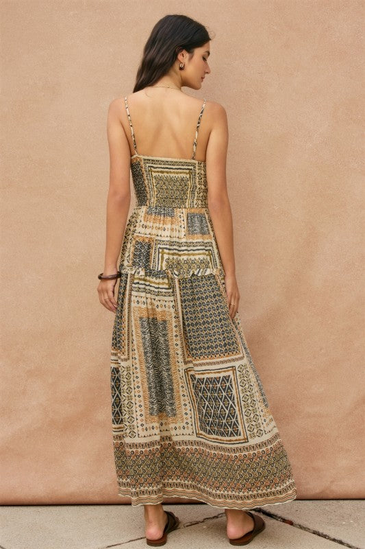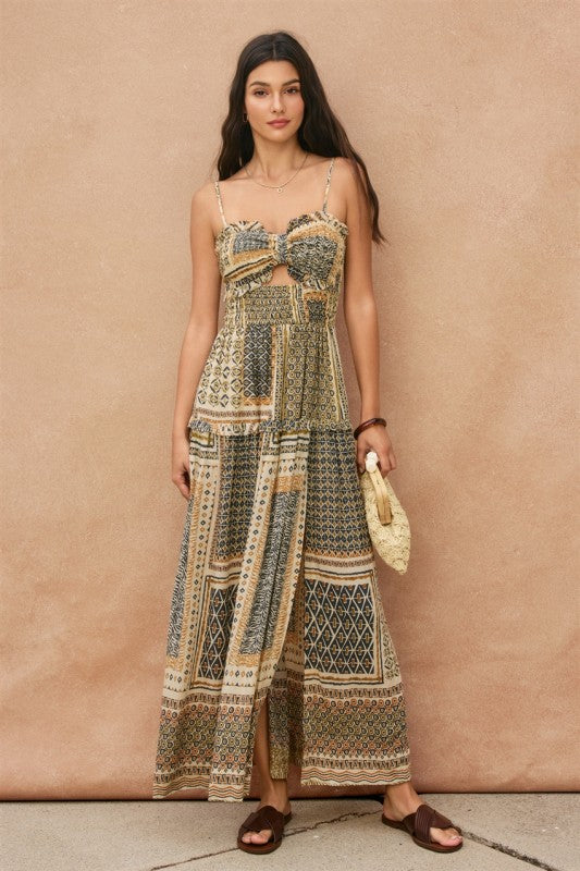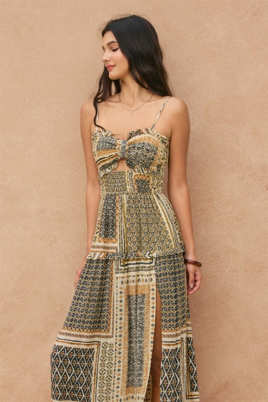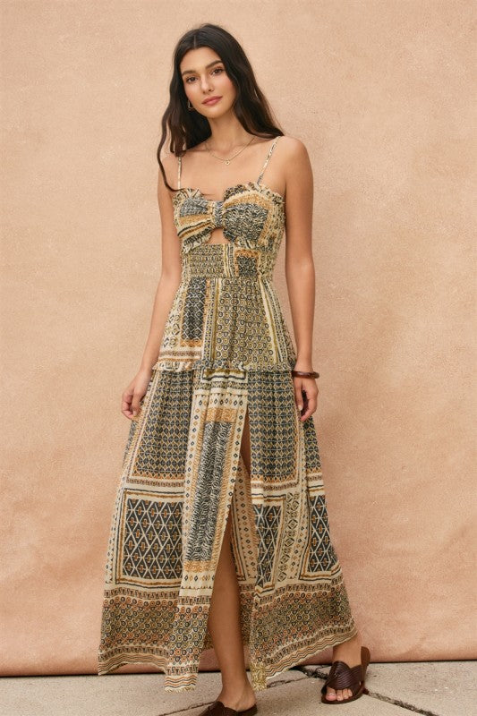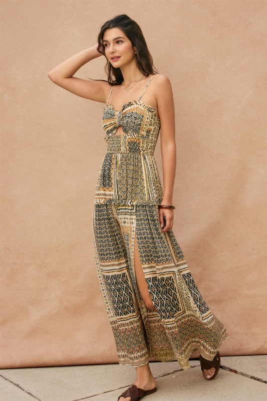 Cut Out Smocked High Slit Maxi Dress.