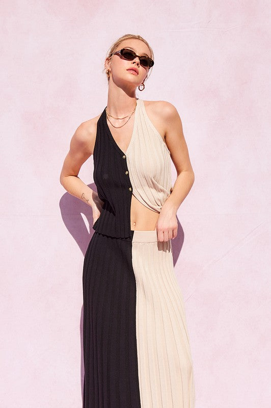 Ribbed Halter Two Tone Top & Maxi Skirt Set