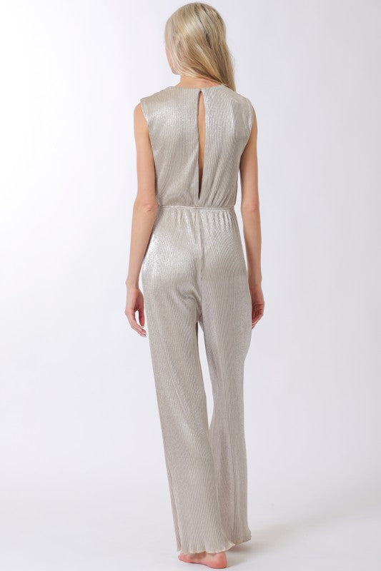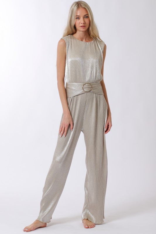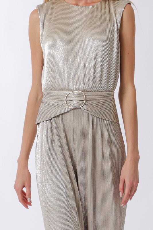 Sleeveless Pleated Shimmery Buckle Waist Jumpsuit