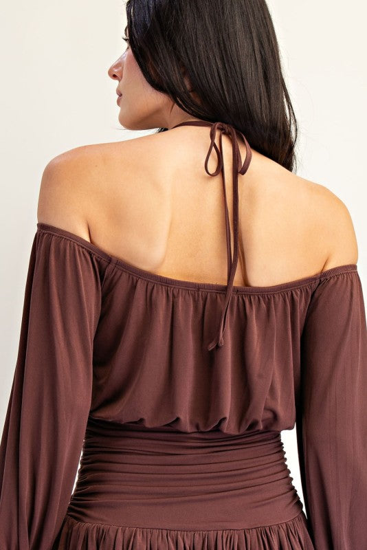 Off The Shoulder Halter Neck Ruffle Long Sleeve Mini Dress